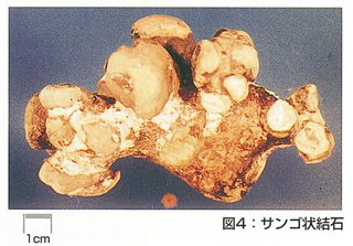 尿路感染が原因で、男性に比べて尿道の短い女性に多い結石の成分です。尿素分解菌が尿素をアンモニアと二酸化炭素に分解します。アンモニアにより尿がアルカリ性になり、この成分の結石が形成されます。いったんこの結石ができると、石が細菌を増やし、細菌は石をますます成長させるという悪循環が起こり、腎盂腎杯の形そのままのサンゴ状結石(図4)となりやすいです。